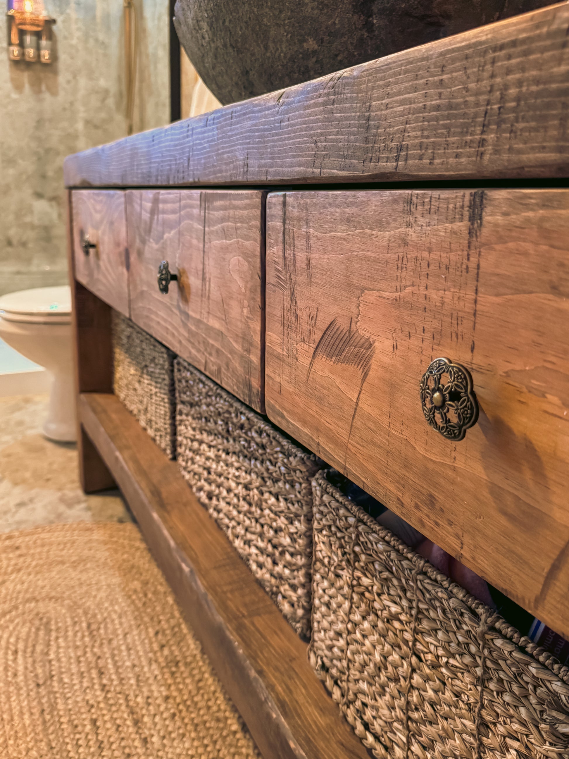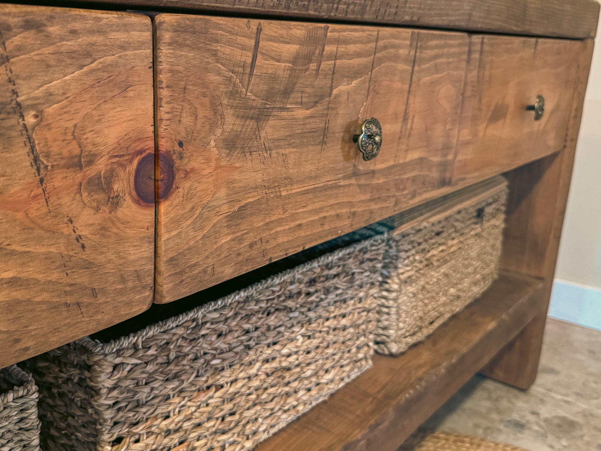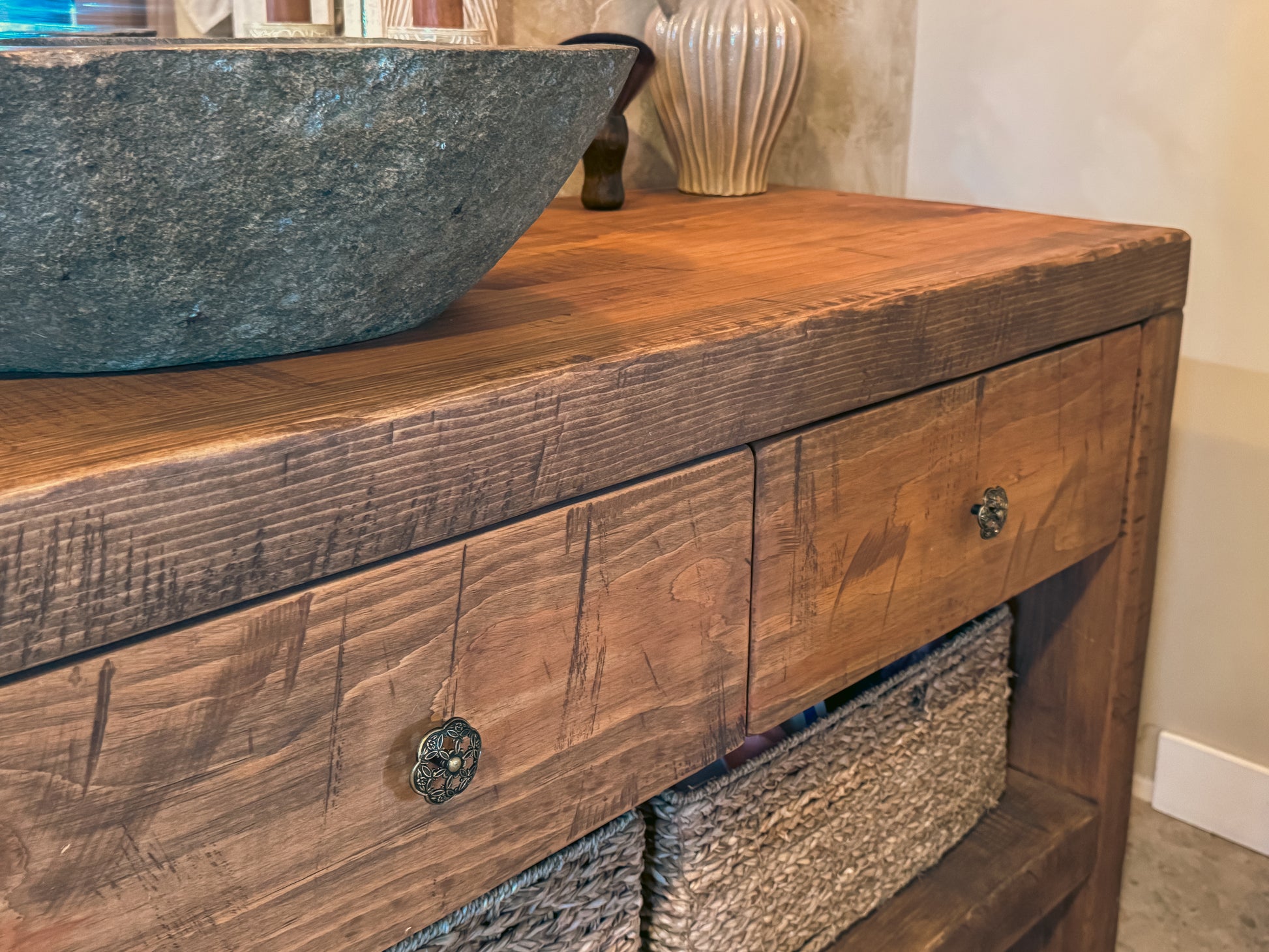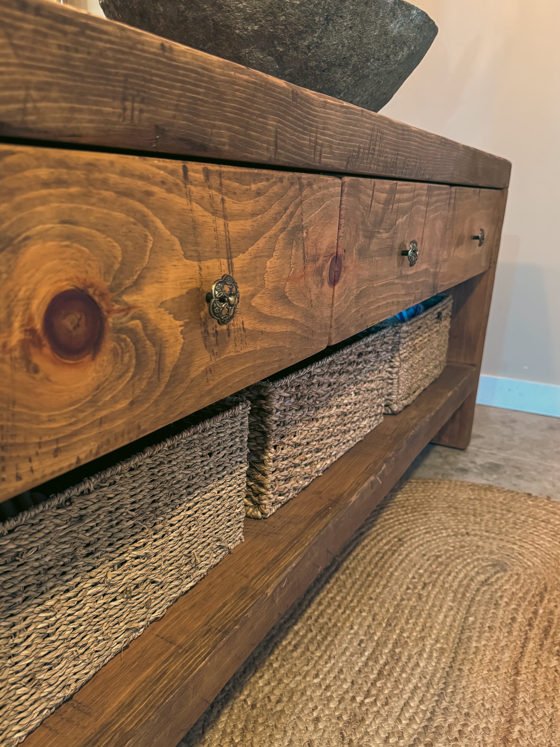 Le meuble est assemblé dans l’esprit des meubles d’autrefois : tenons et chevilles de bois, avec une texture qui laisse sentir le bois au toucher. Les tiroirs sont montés sur quincaillerie Blum (haut de gamme), pour un usage quotidien fluide et solide.