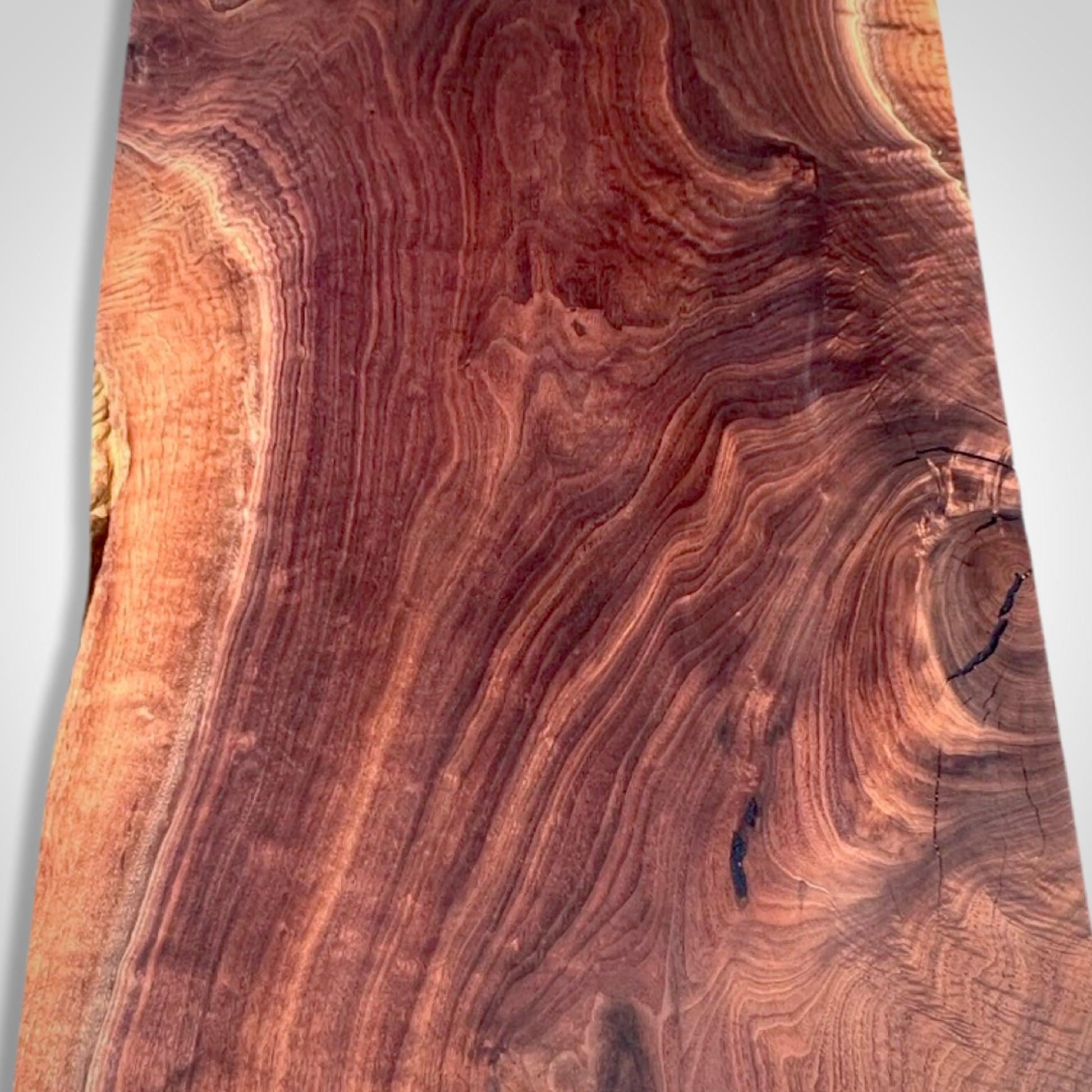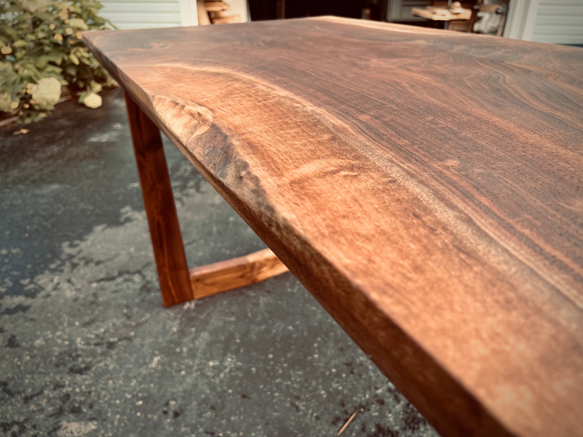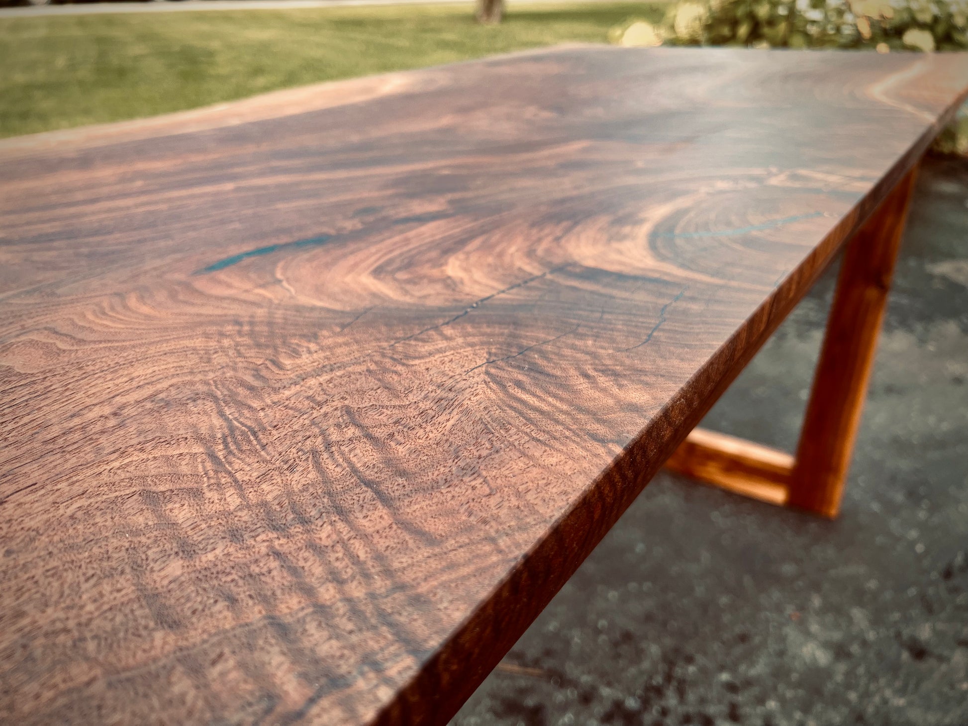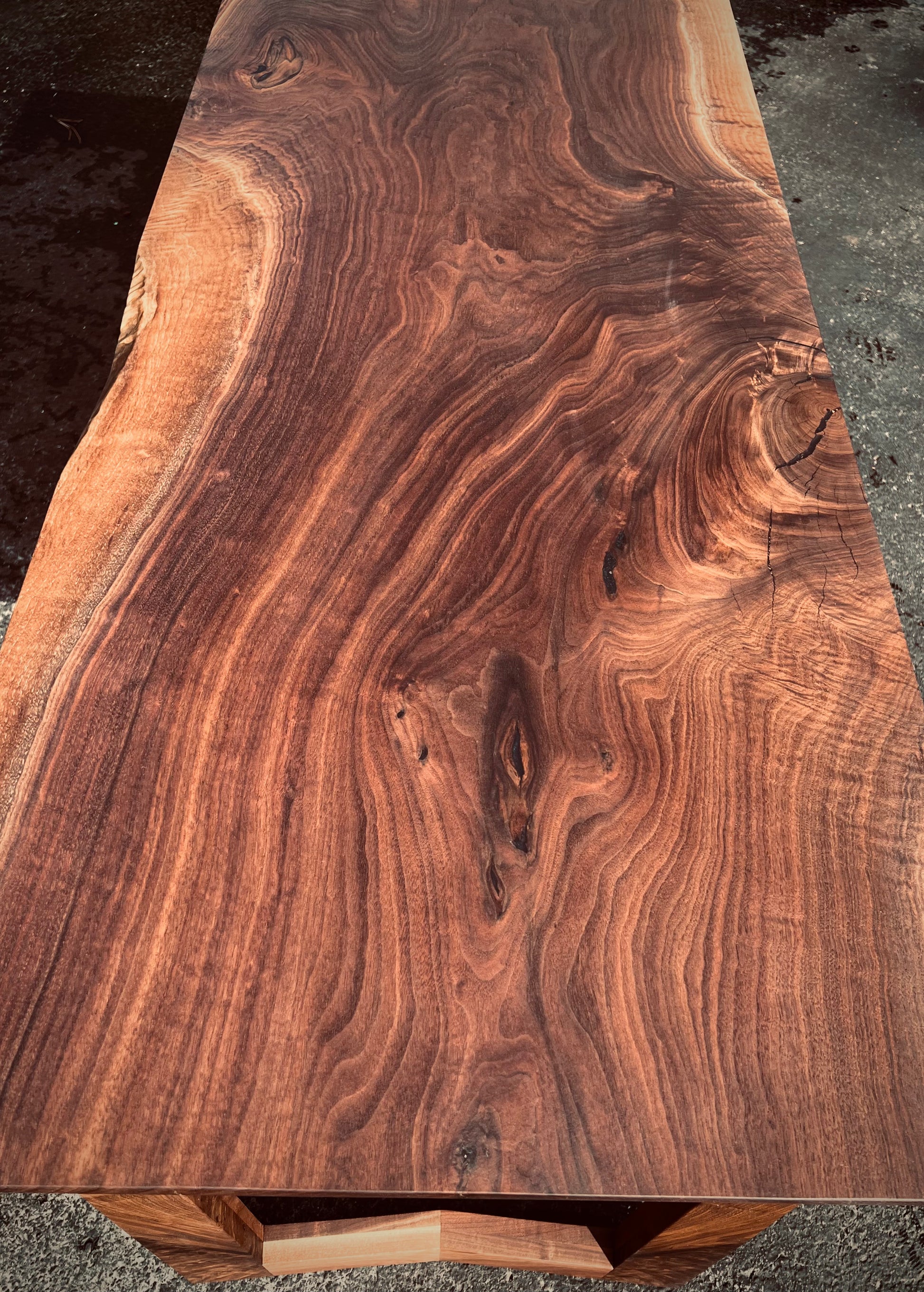 Ce bureau commence par une remarquable dalle unique de noyer noir récupérée localement. Il n'y a pas de photographie truquée, la couleur et la silhouette incroyables semblent presque trop étonnantes pour être réelles. Au lieu de cacher les fissures naturelles, elles ont été mises en évidence avec de l'époxy. Ce plateau est soutenu par une base en noyer personnalisée. Si vous regardez attentivement, le grain du bois sur le piètrement semble être une image miroir de lui-même de gauche à droite, nous appelons cette technique "bookmatch". Rarement, voir jamais appliqué aux bases de bureau comme nous le faisons.