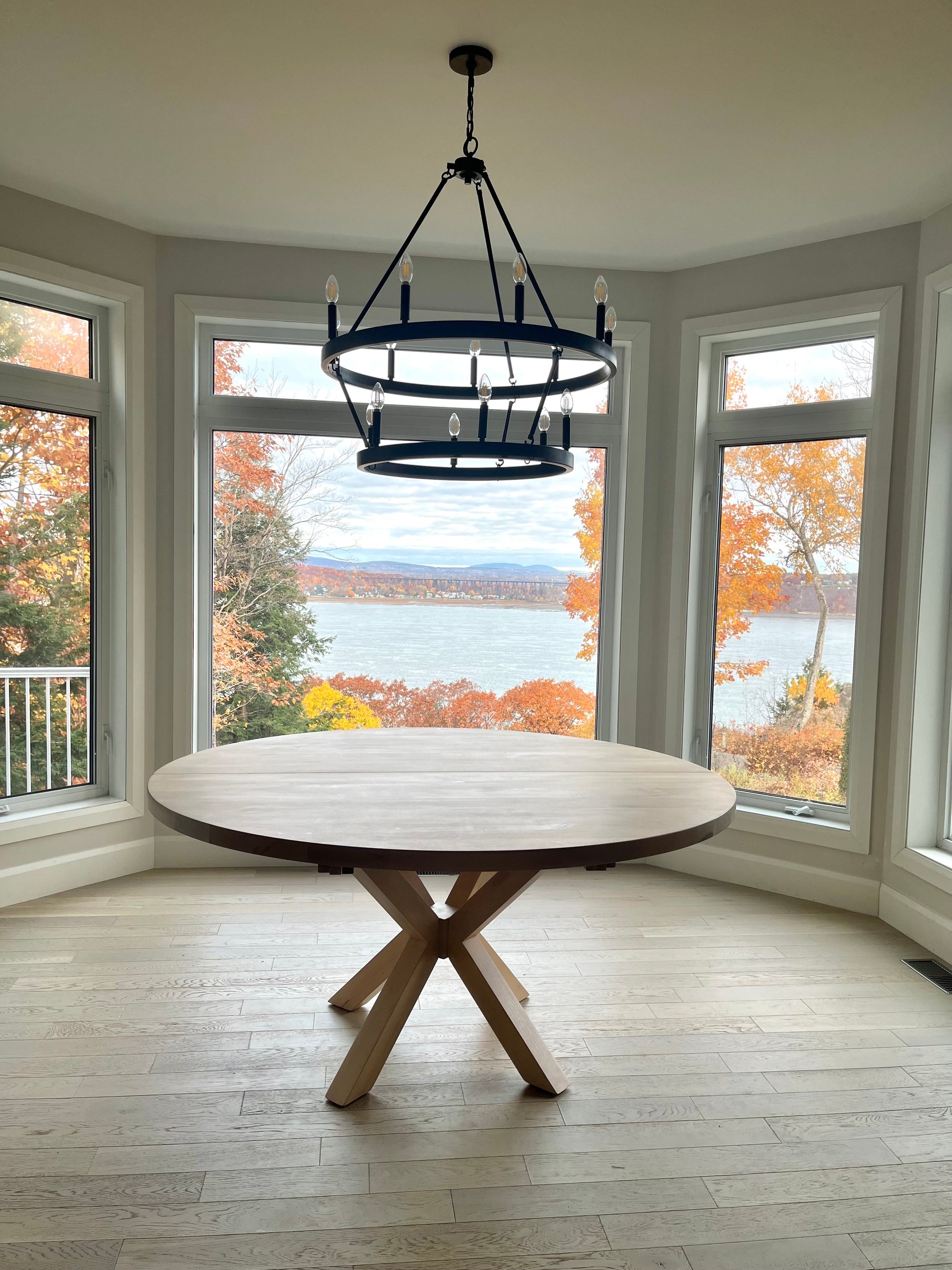La Table Ronde est la plus rassembleuse de nos tables qui permet à tous les invités d'échanger confortablement et de partager un bon repas. Faite de bois massif d'érable ou de chêne, cette table traversera les années avec son look indémodable.