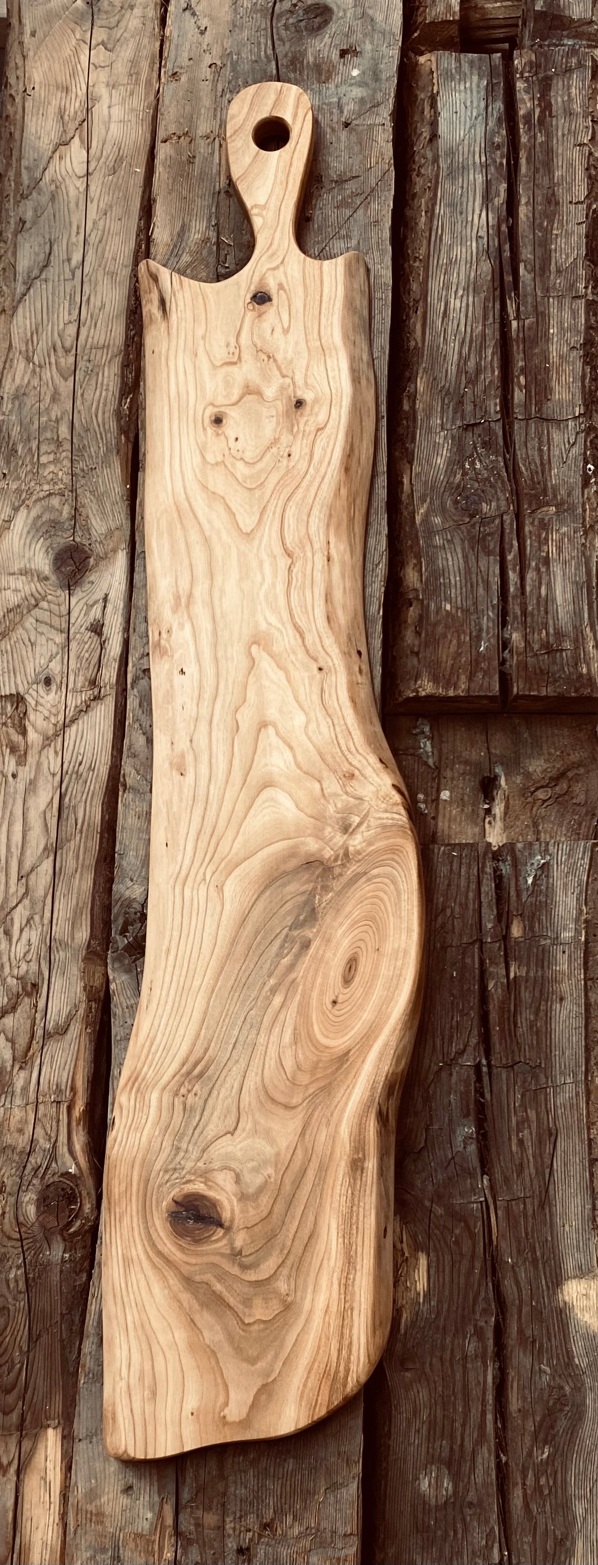 Provenant d’une tranche d’arbre, cette planche a été soigneusement travaillée pour maintenir les formes de l’arbre.